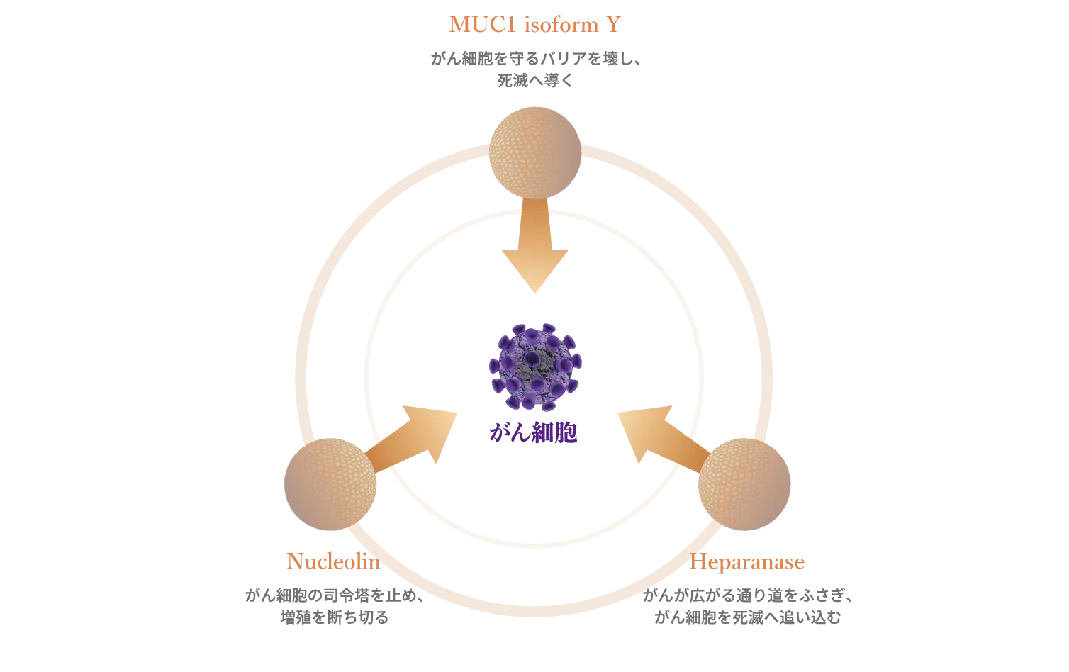がん細胞の表面にある異常なタンパク質に直接結びつき、その働きを妨げます。DNAを用いているため安全性が高く、細胞分裂経路の最上流を標的とするため効果的です。また、抗がん剤や放射線の効果を高める働きもあります。